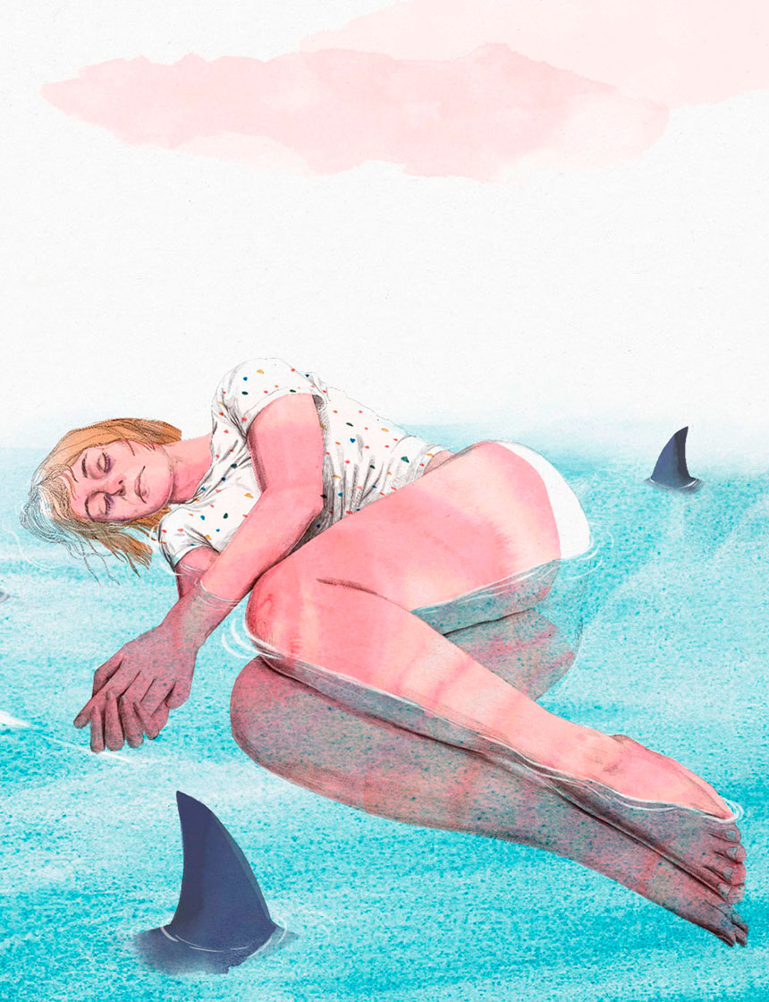 Con la mirada perdida en la marea, Elena se queda medio dormida y sueña que su bote se está rodeado de tiburones. Intentan hacerle daño, diciéndole: «Eres débil», «eres vaga», «no remas fuerte», «estás así porque quieres», «no eres la única con problemas».